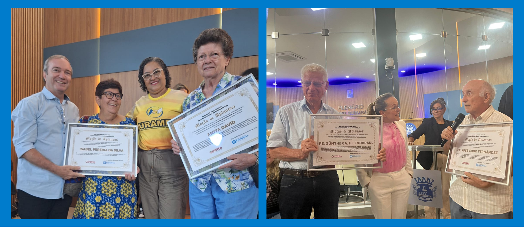 Com o plenário da Câmara lotado, diversas instituições, movimentos populares e grupos que lutam pelo reconhecimento dos seus direitos manifestaram suas demandas e desafios de estarmos vivendo um tempo tão marcado pela negação do acesso a esses direitos e invisibilização de pessoas que sofrem a privação desses direitos fundamentais. Na ocasião foram homenageadas algumas pessoas que atuaram no município em defesa dos direitos humanos: Pe. Günther Lendbradl, Pe. José Cobo Fernandez, Prof. Ivanildo José Ferreira e Baltazar Ferreira, juntamente com as Irmãs Catequistas Franciscanas, Anita David e Isabel Pereira da Silva. Todas elas ligadas a pastorais e serviços na Diocese de Rondonópolis, que na década de 1980 criou e manteve funcionando em suas dependências o Centro de Defesa de Direitos Humanos Simão Bororo, nome que fazia referência ao indígena assassinato juntamente com Padre Rodolfo Lunkenbein em 15 de julho de 1976 na Missão Salesiana de Meruri, em Barra do Garças-MT.